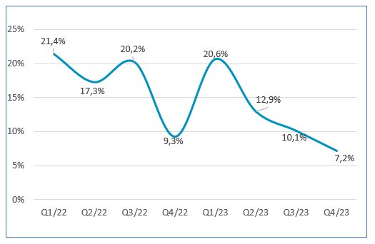 An average growth of 15% has been observed over last 8 quarters.